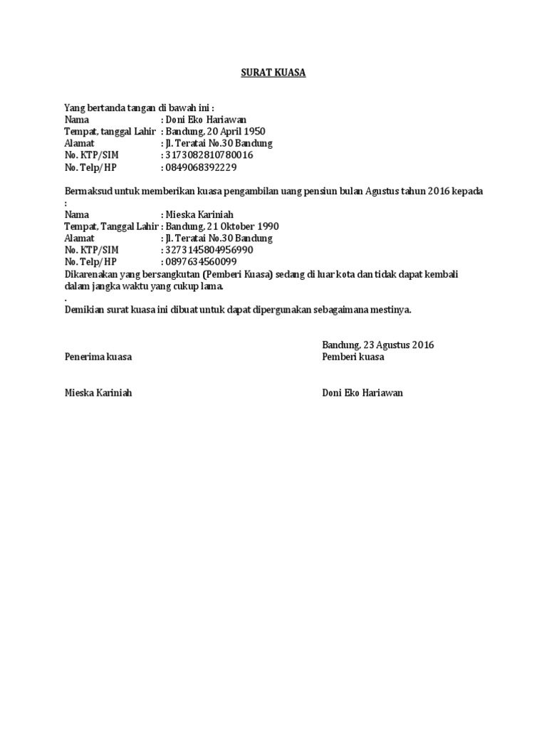Oke, kali ini kami akan membahas suatu artikel yang insya allah bermanfaat sebelum masuk ke contoh contohnya, kamu sudah tau belum sih sebenarnya apa yang dimaksud dengan surat kuasa? Berikut ini adalah contoh lengkap surat kuasa dan cara membuat surat kuasa dengan baik dan benar yang dapat digunakan di berbagai keperluan. Ketentuan tentang surat yang satu ini tersirat dalam pasal. Dalam hal pelimpahan wewenang dimaksud, maka pemberi salah satu contoh penggunaan surat kuasa adalah untuk mengambil bpkb kendaraan bermotor. Surat kuasa biasa ialah surat yang dibuat oleh seseorang atau instansi atau perusahaan yang berisi tentang kekuasaan atau memberikan kekuasan kepada orang lain.