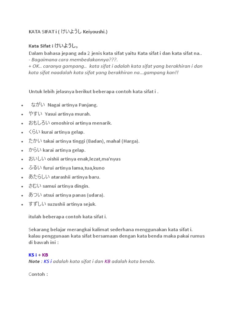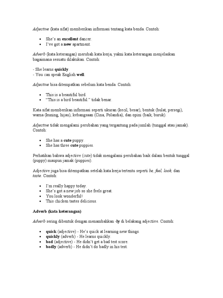Simak contoh kalimat kata sifat dalam bahasa inggris berikut ini: Merupakan kata sifat yang digunakan untuk mendeskripsikan kata benda. Kata sifat dasar, yaitu kata sifat yang sama sekali belum mengalami proses penambahan imbuhan. Kata sifat dapat diingkari dengan menggunakan kata tidak. Kata reugreug ini tergolong kata sifat yang menunjukkan suasana hati atau perasaan seseorang. Kata sifat juga dapat diberikan keterangan yang berfungsi sebagai pembanding, seperti lebih contoh: Adjective (adj) adalah nama lain dari kata sifat dalam bahasa inggris. Secara keseluruhan, kata sifat digunakan sebagai penjelas dan pembentuk. Contohnya adalah it is a beautiful ring (ini adalah cincin yang cantik) dan this ring is beautiful (cincin ini cantik). Daftar kata sifat dalam bahasa. Bawalah payung agar tidak basah kuyup saat hujan turun. Merupakan adjective yang digunakan menanyakan sebuah kata benda. Penjelasan di atas mungkin sudah cukup jelas maka terdapat juga beberapa contoh kalimatnya.